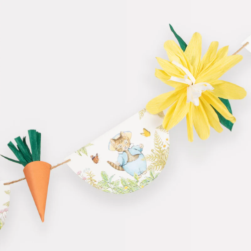 This gorgeous garland is perfect for Easter, baby showers or birthday parties. Hang it on the wall, on a doorway or drape on your party table, to create a beautiful party centerpiece. It features nostalgic designs of Peter Rabbit and his friends based on vintage illustrations, teamed with crepe paper flowers and carrots.