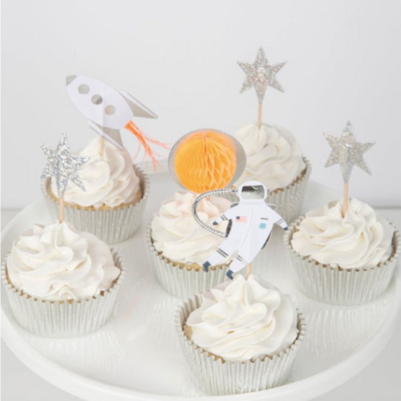 To celebrate a successful mission launch into the party atmosphere you will most definitely want these Space Cupcake to celebrate  a successful mission and to share with your fellow space adventurer's! Shop the full out of this world space collection form Meri Meri Party in our Space Party Theme. Rocket toppers have neon coral thread details, Astronaut toppers have shiny silver metallic round cords, Planet toppers have neon orange honeycomb centers, Star toppers have a silver holographic foil effect, Shiny silver foiled cupcake cases Wooden cocktail sticks Packaging made using sustainable FSC paper